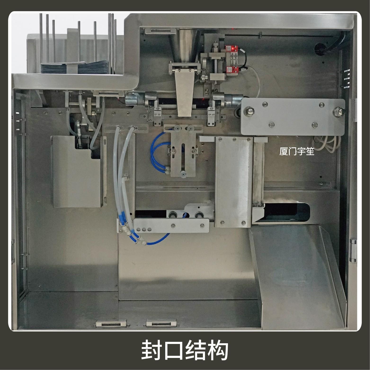 2、調(diào)試方便、占用空間小。包裝流程全自動,無需人工操作??筛鶕?jù)充填物料的性質(zhì)選配不同的下料結(jié)構(gòu)。